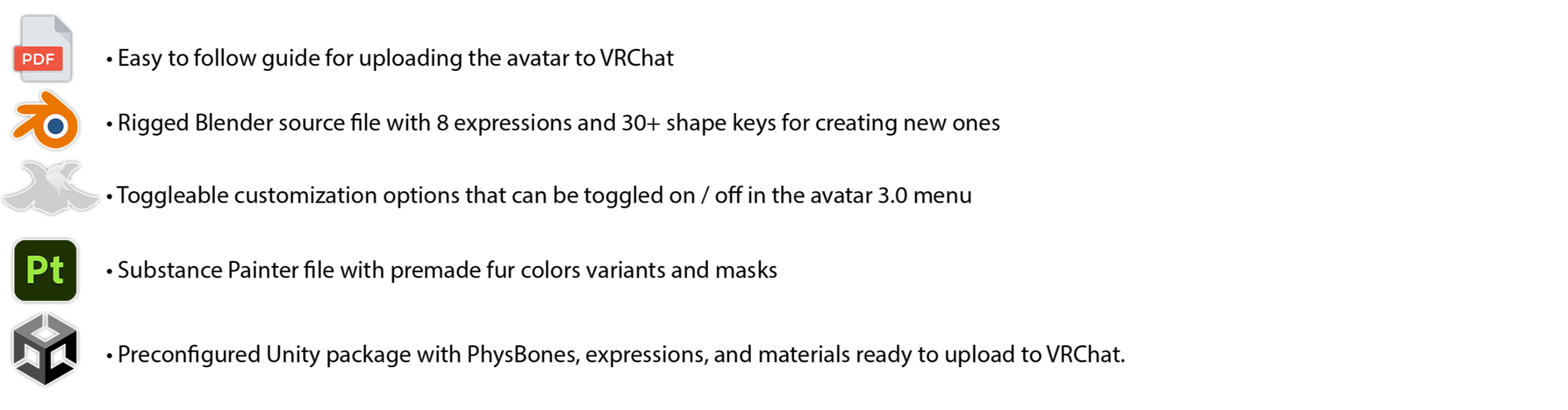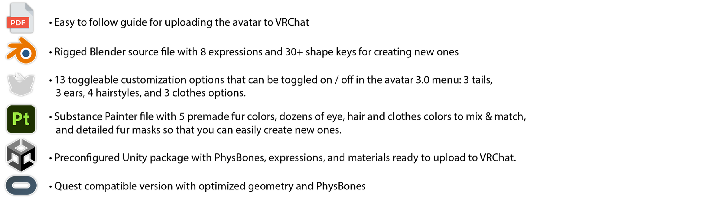 ❗The Substance Painter file was made with Substance Painter 2023 and is not compatible with older versions.❗Due to the nature of VRChat's performance ratings, the quest version does not have the customization options that the PC version has.