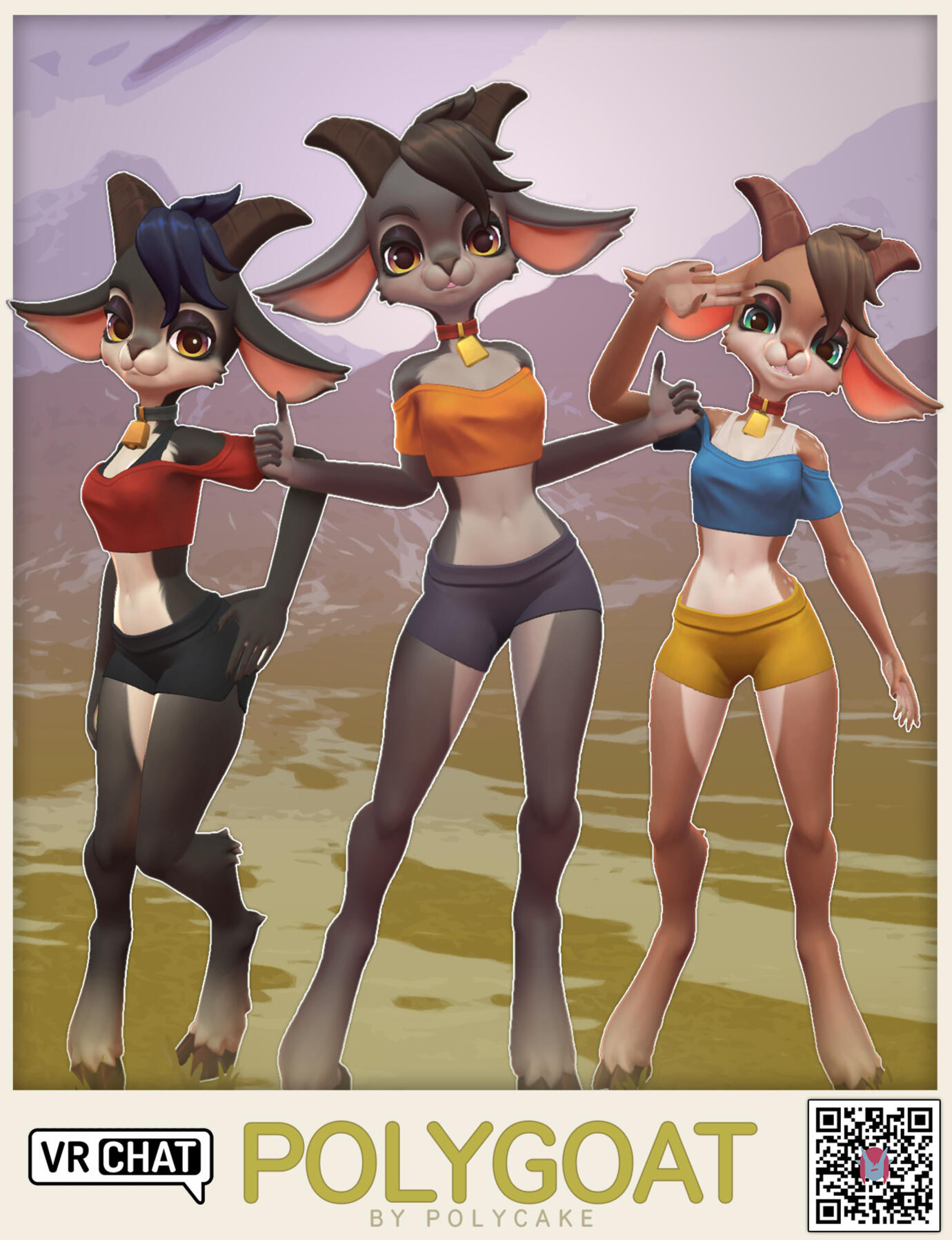 Polygoat is a fully made-from-scratch model for VRChat. It has optimized geometry, materials and PhysBones for a good performance rating in VRChat. It comes preconfigured with PhysBones, expressions, and customization toggles. I hope you enjoy Polygoat!