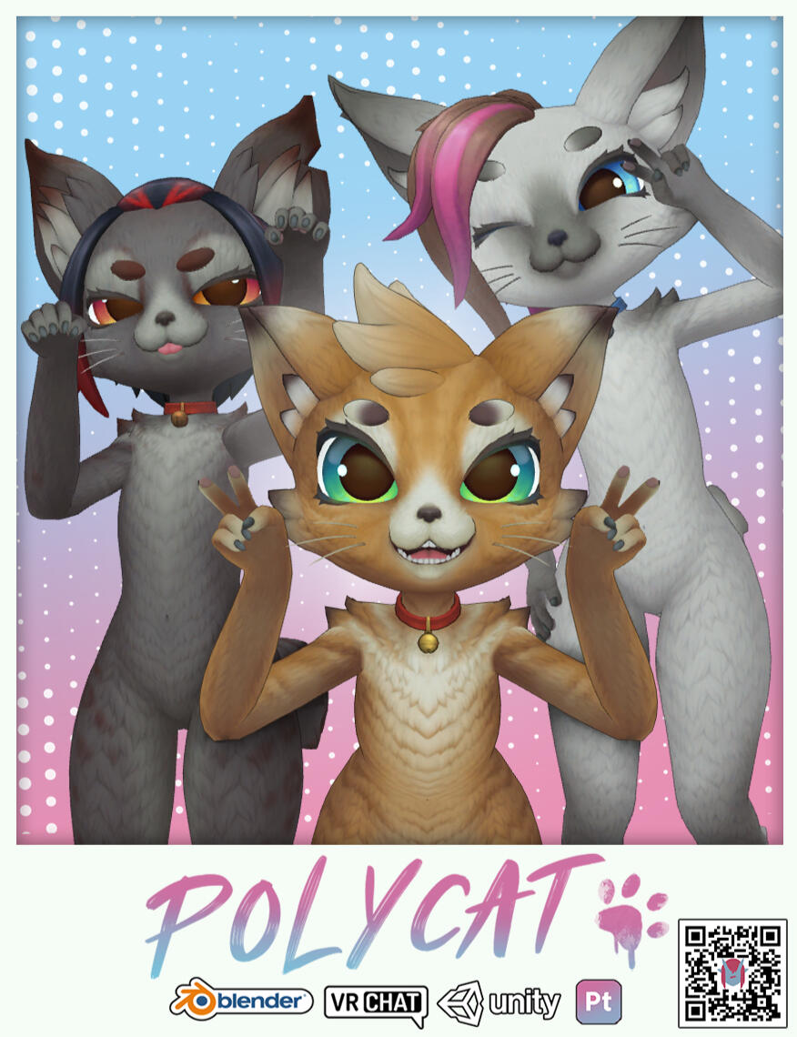 Polycat is a fully made-from-scratch & hand-painted model for VRChat. With version 1.1 I've ported the texture setup to Substance Painter so that making your own new custom fur colors is easier than ever. I've also optimized the avatar to have much better performance in-game. I hope you enjoy Polycat!