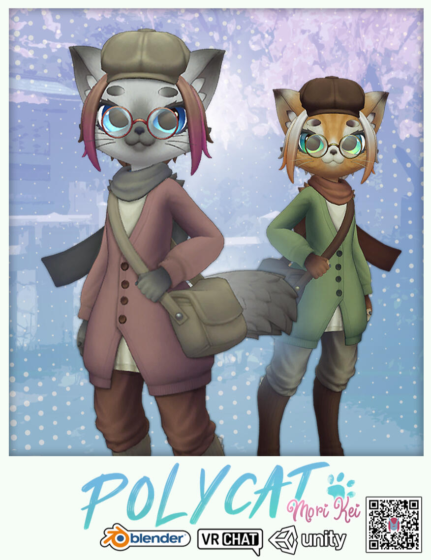 This is the first outfit I've released for the Polycat avatar. It includes the same body and hair customizations but now has a Japanese Mori Kei-inspired outfit. Various pieces of the outfit can be toggled on or off with the expressions menu. With version 1.1 I've ported the texture setup to Substance Painter so that making your own new custom fur colors is easier than ever. I've also optimized the avatar to have much better performance in-game. I hope you enjoy this cozy cat!
